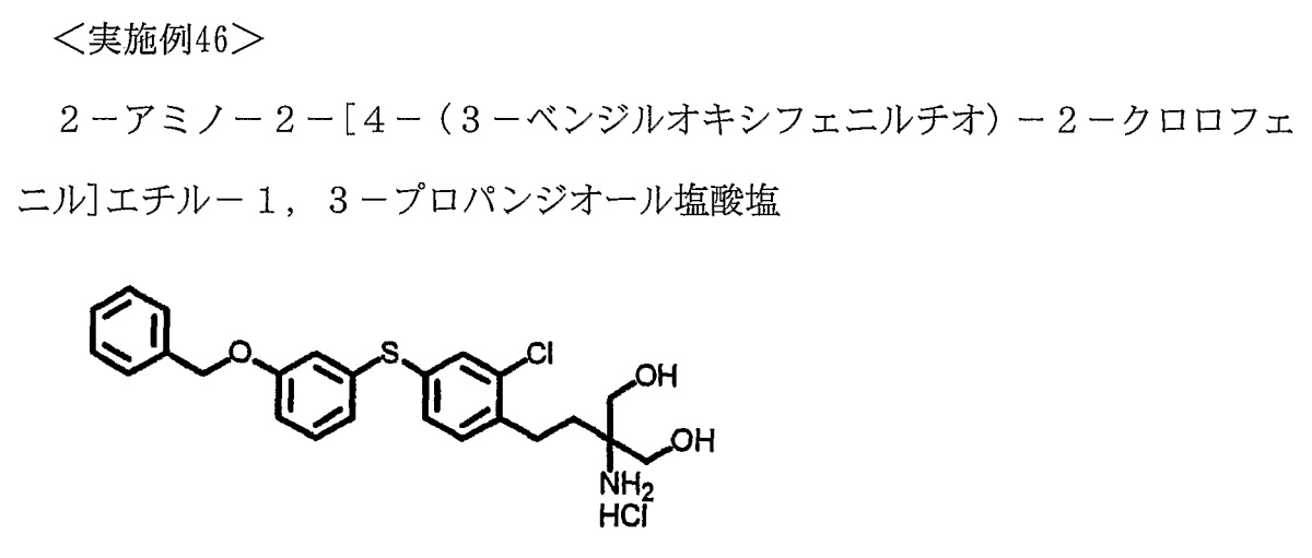 との記載があること、同明細書に記載されている引用文献WO2003/029205(PCT/JP2002/009865; 出願人は杏林製薬; 国際出願日は2002年9月25日)には免疫抑制作用を有する新規ジアリールスルフィド誘導体(実施例46)として同化合物が記載されていることから、