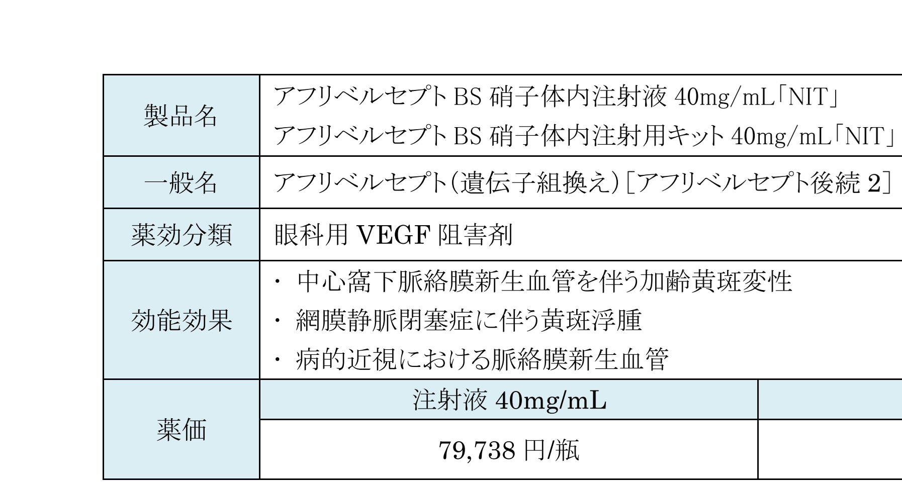 - 〈血管新生緑内障〉アフリベルセプト(遺伝子組換え)として1回、2mg(0.05mL)を硝子体内投与する。なお、必要な場合は再投与できるが、1ヵ月以上の間隔をあけること。