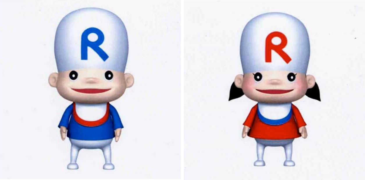 目薬を扱うロート製薬らしく、つぶらな目が特徴の兄妹キャラクター。CMやウェブコンテンツで使われているようです。年齢は5歳のようですが、職業はロート社員で働き者(https://x.com/eyecare_cp/status/1379324011780349954)。上記それぞれの図形(左が「ロッ太」、右が「ロッチー」)と「ロッタ」と「ロッチー」の名称は商標登録されています(第4864271号、第4864272号、第4933234号、第4933235号、第4916070号、第4961171号)。ロート製薬には、ロート公式Youtuber「根羽清ココロ」というキャラクターもいます(商標登録6375477号)。