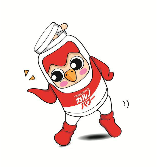 「カルノちゃん」はL-カルノシン含有加工食品カルノパワー(浜理薬品栄養科学株式会社)のキャラクター(浜理薬品工業ホームページ)。パッケージ(ボトル)そのものに目や手足を付けたり帽子をかぶせたりして擬人化させているのではなく、鳥?のように動物化させることでパッケージをアレンジさせたという点で「かんちゃん」(イチジク製薬)と同じキャラクター分類といえるかもしれません。「カルノちゃん」の上記図形と名称は商標登録されています(第6286589号、第6286590号、第6286588号)。神農祭のイベントにも登場(上記神農祭イベント写真参照)。