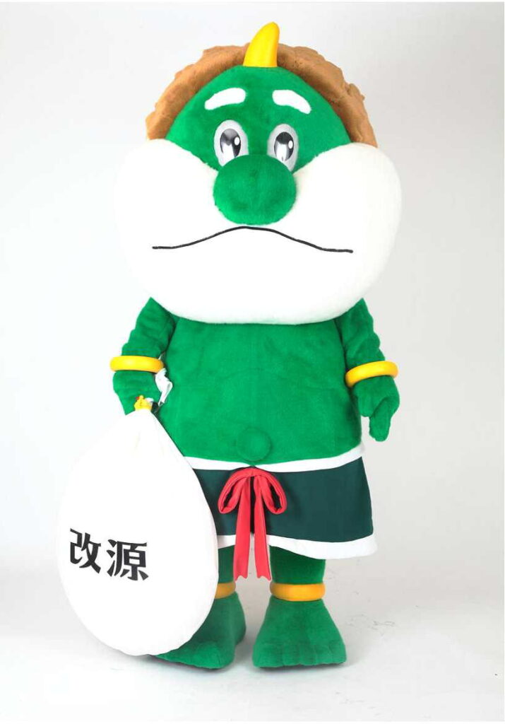 「カイゲンの風神さん」は俵屋宗達の「風神雷神図屏風」の風神をキャラクター化したカイゲンファーマのマスコットキャラクター(2021.09.28 カイゲンファーマ:風神さんと決めゼリフをリニューアル! かぜ薬「改源」)。2021年から、可愛いぬいぐるみとなって活躍中(改源のカイゲンファーマ【公式】X)。キャラクターのぬいぐるみや上記着ぐるみが商標登録されています(第5663408号、第6850451号、第6641123号)。神農祭のイベントにも登場(上記神農祭イベント写真参照)。