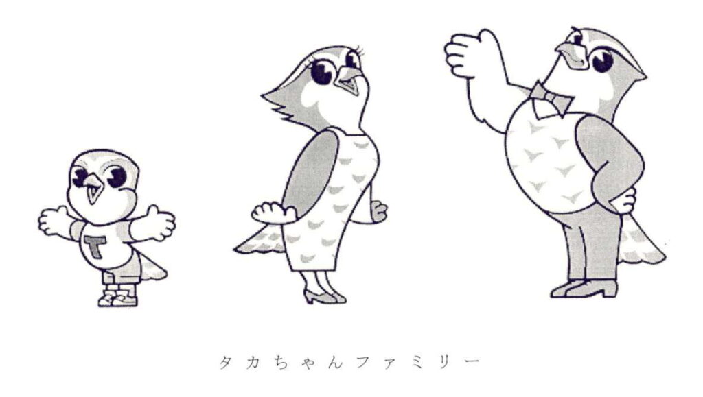 「タカちゃんファミリー」は高田製薬イメージキャラクター。高田製薬がある埼玉県は、オオタカの生息地。その「タカ」から「高田製薬」を連想してもらえるようタカの家族をイメージキャラクターにしたそうです(高田製薬ホームページ)。上記図形は商標登録されています(第5682385号、第5682384号)。ファミリーというキャラクター設定という点では、「カバくん」(健栄製薬)、「イソくん・イソパパ・イソママ」(アイノヴァ)、「フジちゃん」(富士薬品)と同じキャラクター分類といえるかもしれません。