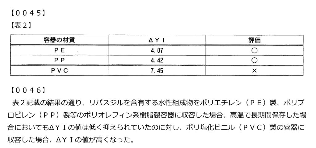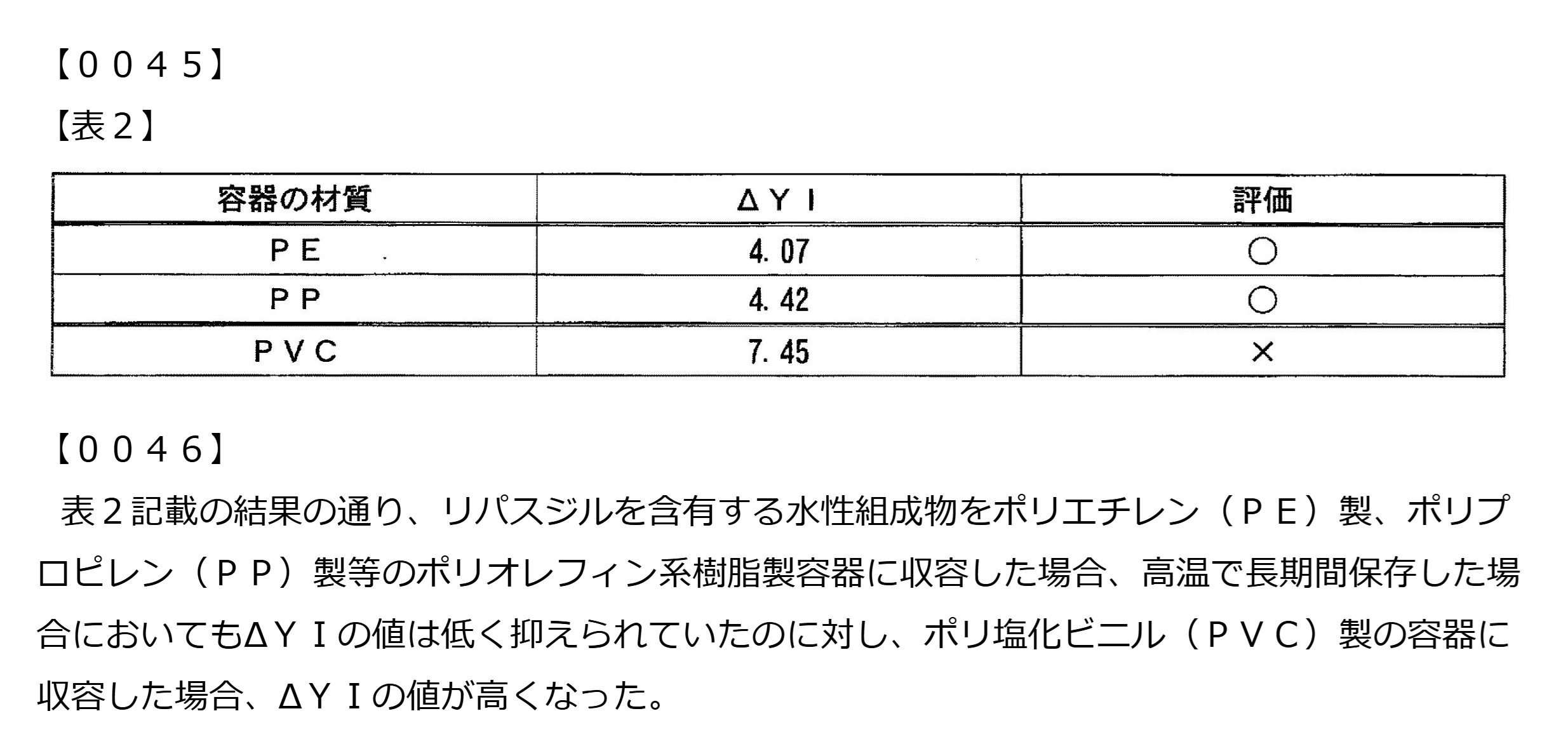 リパスジルを眼科用剤として製剤化するにあたり、特定の材質の容器に収容した場合、高温・長期保存下で変色が生じるという問題が生じることが判明した。本件各訂正発明は、容器材質をポリエチレン又はポリプロピレンから選択されるポリオレフィン系樹脂製とすることで、60℃・3か月保存後の変色(ΔYI)を5未満に抑制し、保存安定性に優れた医薬製剤を提供する点に技術的特徴を有する。