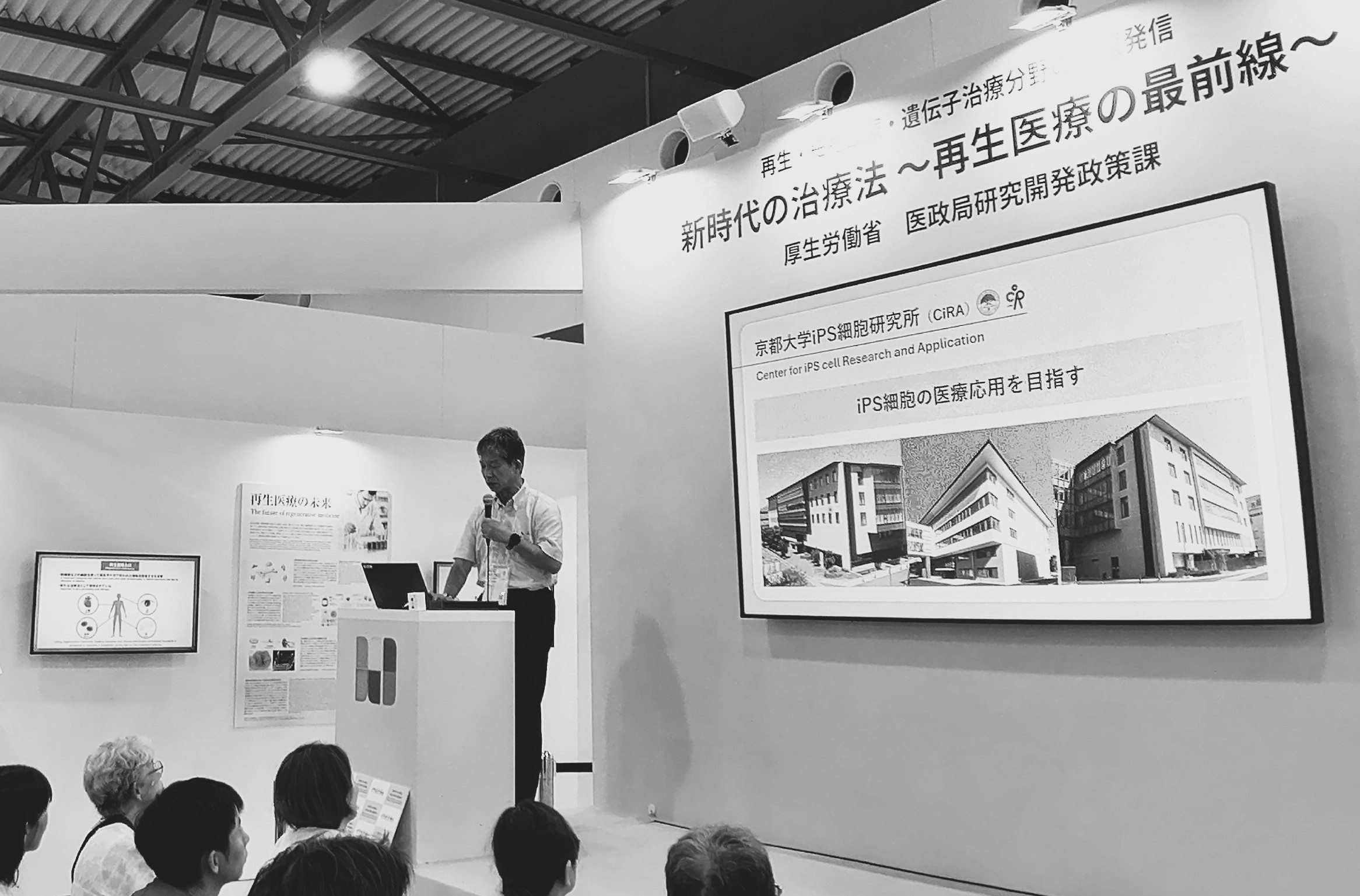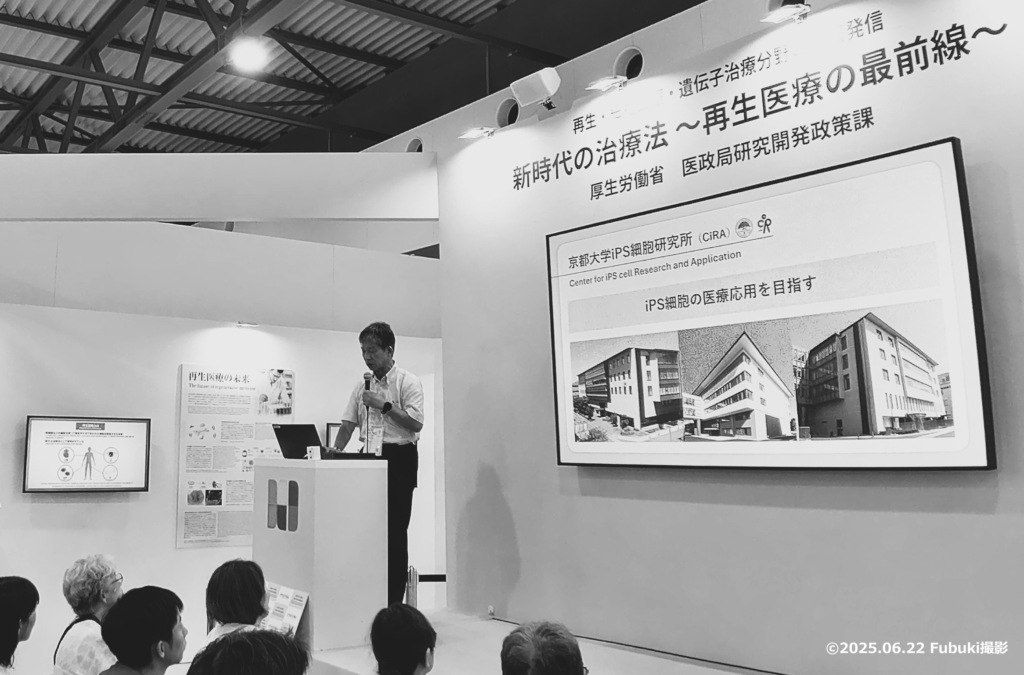 大阪関西万博では、iPS細胞から作製した心筋細胞が拍動する「iPS心臓」や心筋シートがパビリオンなどで展示されました。厚労省/経産省も「HEALTH DESIGN 輝き、生きる。Live Brighter」 と題したイベントに出展。再生医療等医薬品の展示や再生医療の最前線の説明など、万博会場に訪れた一般市民からも高い関心を集め、再生医療の意義を伝える重要な機会となりました。
